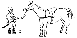 The horse must have bell boots and either polo wraps or galloping boots on all four legs. This is to protect them during close contact plays. If a player does not wrap his horse correctly and the leg wraps come loose during play then the umpire will call time out, the wraps will be fixed and the other team will get the ball. The horse must have a breastplate on to keep the saddle from sliding back during the match. Any bridle which has long or protruding side bars is prohibited. Since the horse is 80% of the game great care is taken to insure that it's equipment is safe and in good condition.